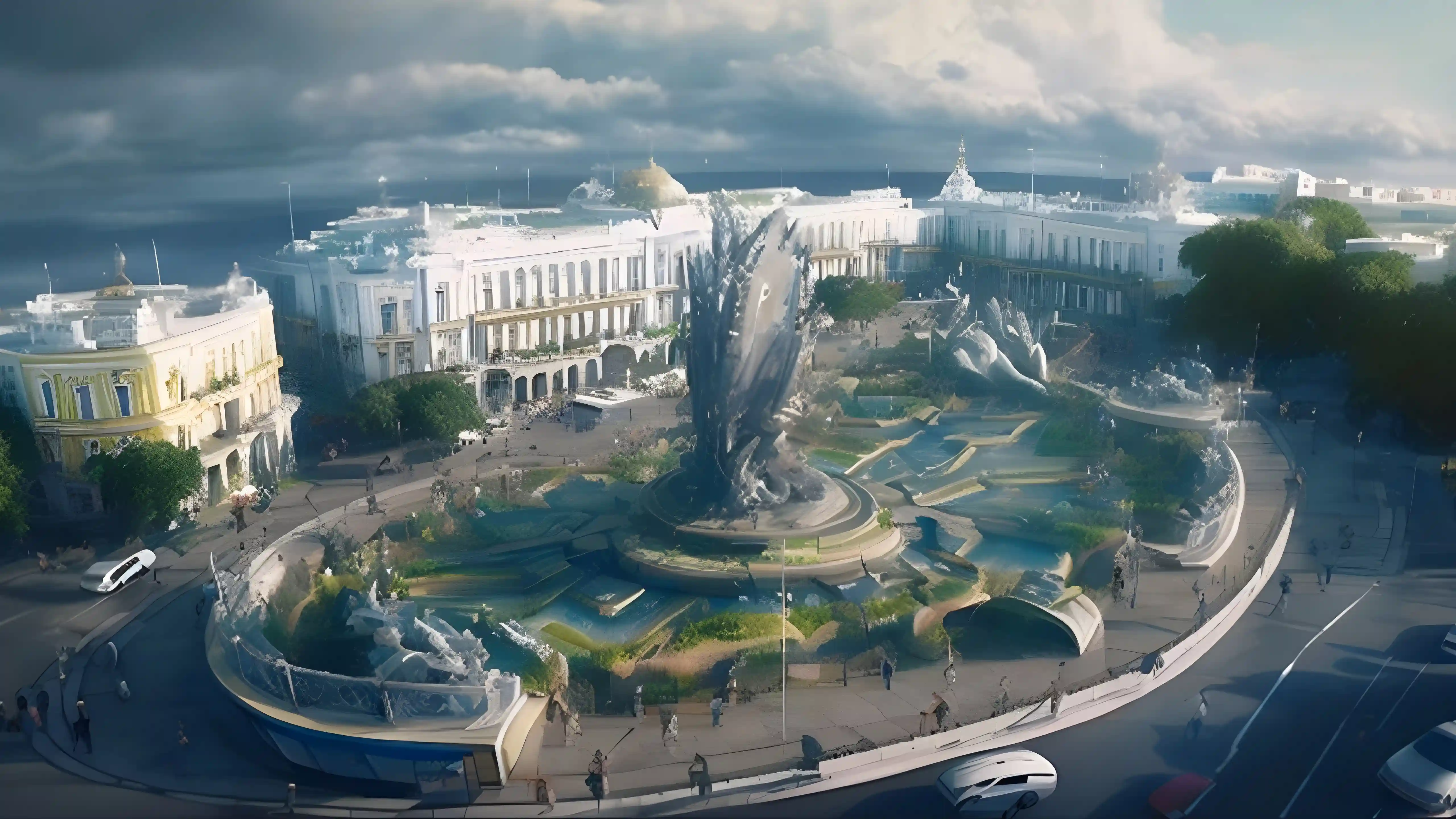Ракета від система залпового вогню «Смерч» на тлі зруйнованої будівлі Харківської обласної адміністрації, по якій російські війська неодноразово завдавали ракетних ударів на початку повномасштабного вторгнення. 11 квітня 2022 рік